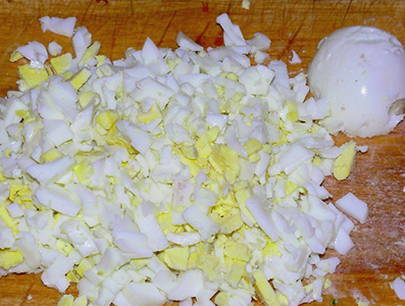 Hardgekookte eieren, pellen en fijn hakken.