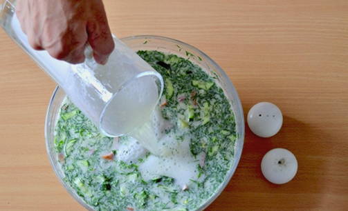 Giet gekoeld kwas erin, roer okroshka.