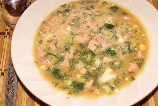 Een van de meest populaire zomersoepen is kvass okroshka met worst en aardappelen. Het is ongelooflijk eenvoudig en snel te bereiden, maar duurt niet lang in de koelkast.