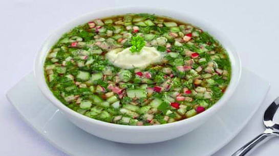 Okroshka is klaar, je kunt het op tafel serveren.