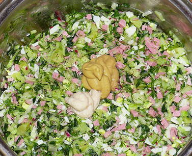 - Doe alle gehakte ingrediënten in een pan, voeg mosterd, mierikswortel, zout en gemalen peper toe.