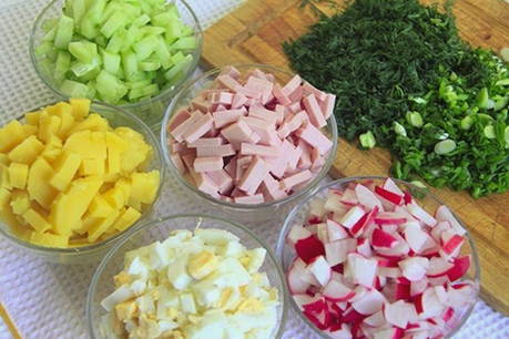 Was de groenten. Snijd radijs, komkommer, aardappelen, eieren en worst in blokjes van ongeveer dezelfde grootte.