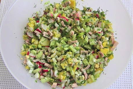 Meng vervolgens alle ingrediënten met de gekoelde dressing, zout naar smaak en de okroshka is klaar.