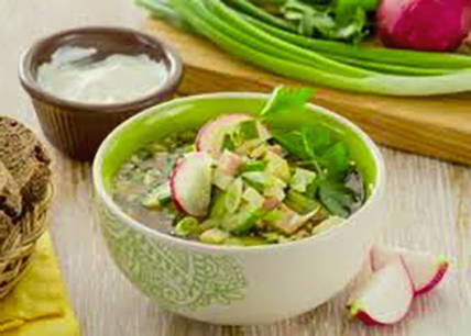 - Verfrissende okroshka op kwas met worst en radijs