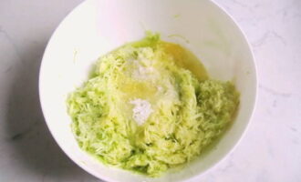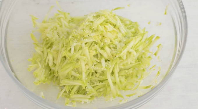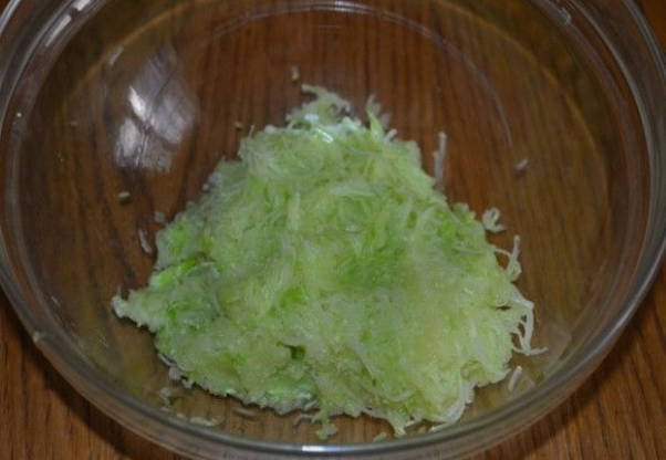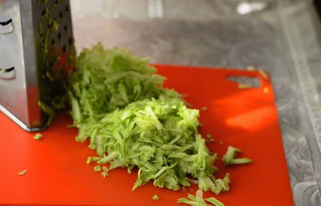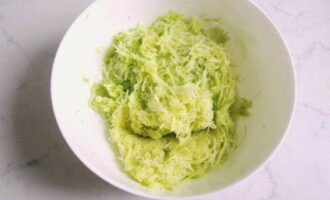 - Neem bij voorkeur een jonge courgette, zodat u de schil niet hoeft af te pellen. Wrijf de voorbereide courgette op een grove rasp.