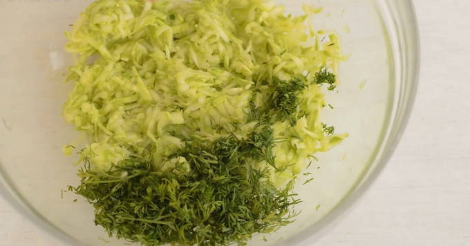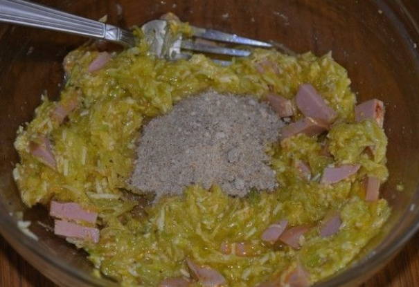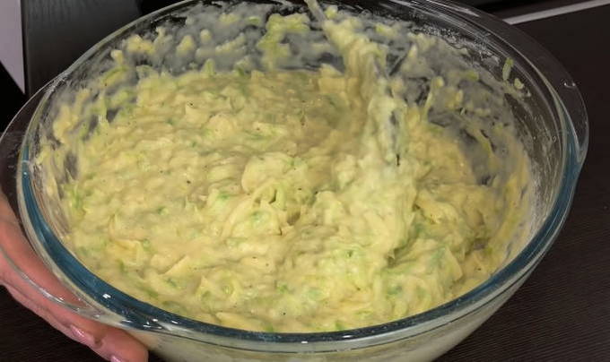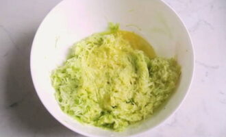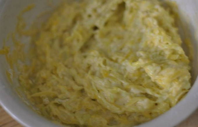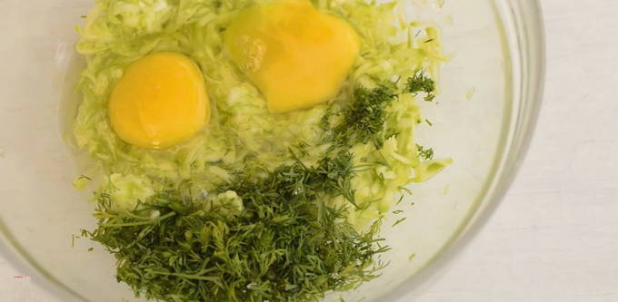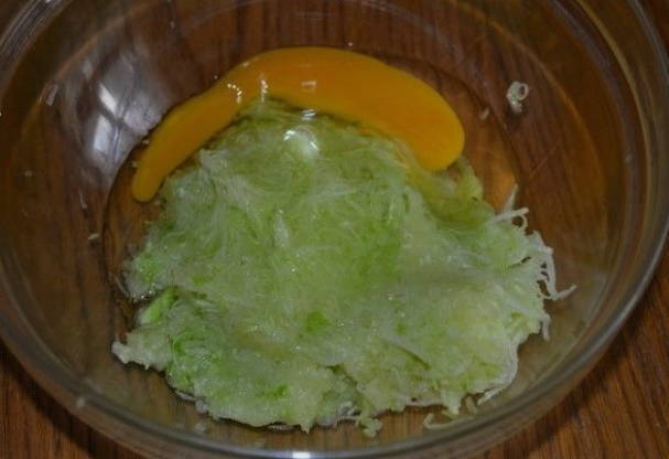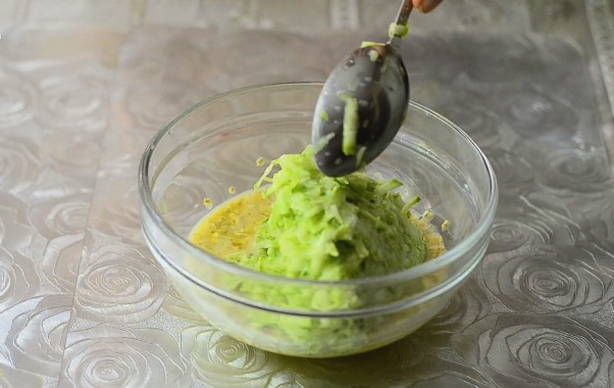 - We wrijven de voorbereide, goed gewassen en gepelde courgette met een grove rasp en combineren met eieren, bloem, knoflook door een pers en roeren alle componenten goed.