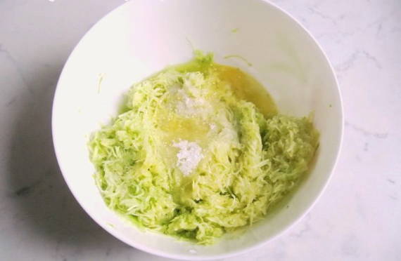 - Om de pannenkoeken te bereiden, spoelt u de jonge courgette goed af en wrijft u deze samen met de schil op een grove rasp in zijn geheel. Voeg tegelijkertijd een beetje zout toe zodat de courgette het sap sneller op gang brengt.