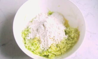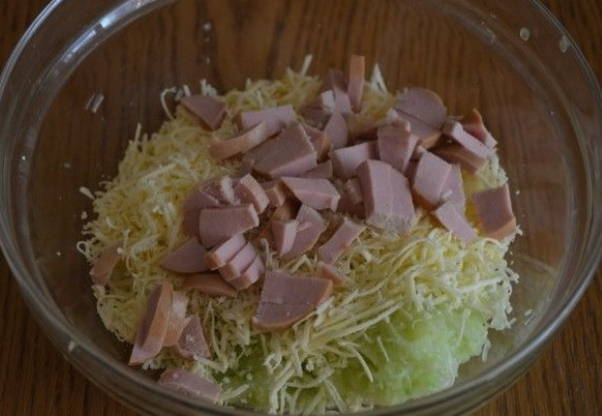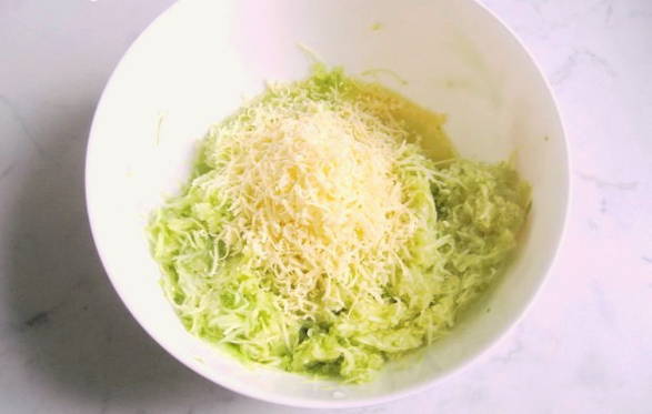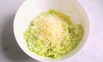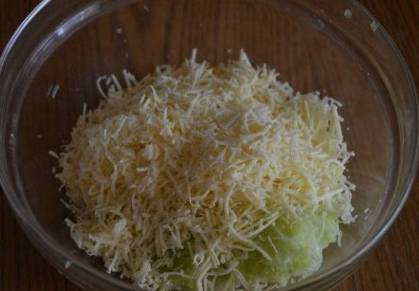 - Voeg vervolgens de op een fijne rasp gehakte kaas toe tot een homogene courgettemassa en meng goed.