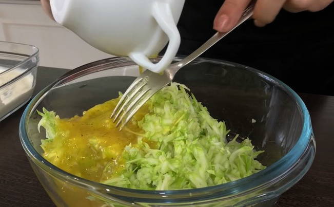 - Klop in een aparte kom eieren samen met zout en zwarte peper met een vork. Vervolgens combineren we de eiermassa met gehakte courgette.