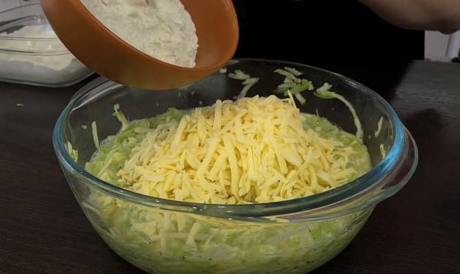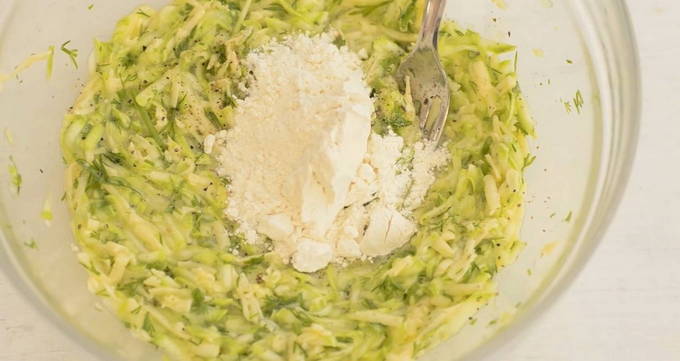 - Meng in het kuiltje courgette de op een grove rasp geraspte kaas en een beetje bloem om in te dikken.