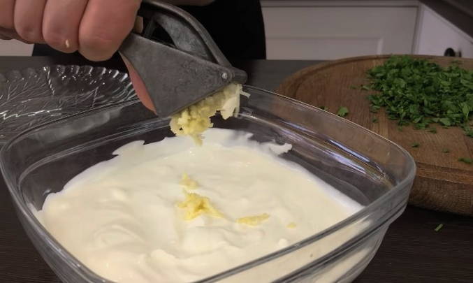 - Gelijktijdig met de bereiding van de pannenkoeken maken we de knoflook-zure roomsaus. Meng hiervoor de knoflookteentjes door een pers in de gekoelde zure room.