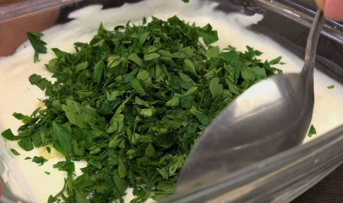- Voeg vervolgens gehakte peterselie toe en meng goed. Laat u bij de keuze voor groen leiden door uw voorkeuren.