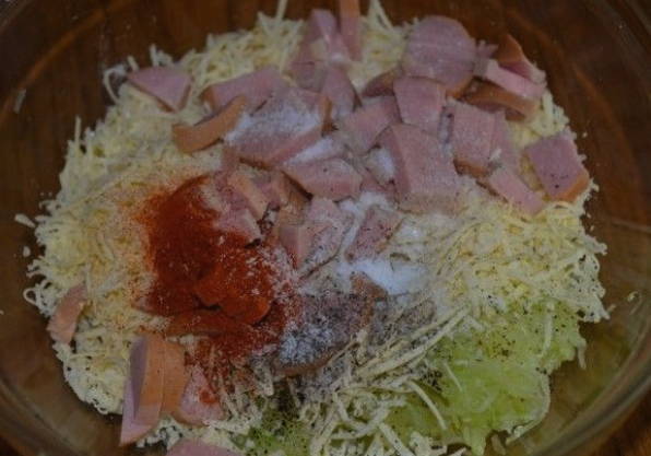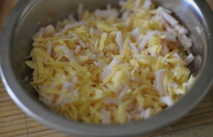 - Als vulling gebruiken we geraspte kaas en ham, in reepjes gesneden. Voeg in hetzelfde stadium zout met gemalen zwarte peper toe aan het deeg.