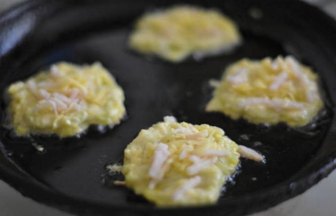 - Vul de pan rijkelijk met plantaardige olie en begin de pannenkoeken te bakken, vorm ze met een lepel. Bak aan elke kant tot een harde gouden korst verschijnt.