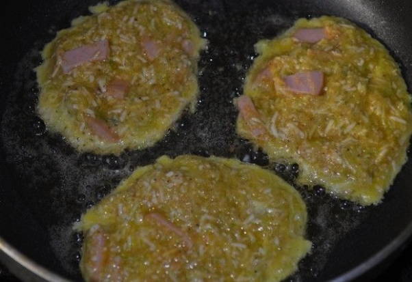 - Courgettepannenkoekjes met kaas en ham in een pan