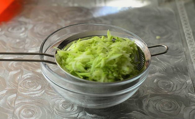 - Daarna wrijven we het op een middelgrote rasp en knijpen we, waardoor overtollige vloeistof wordt verwijderd.