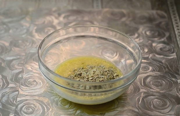 - Klop in een aparte kom twee eieren lichtjes en voeg gezonde instant havermout toe. Meng alles goed.