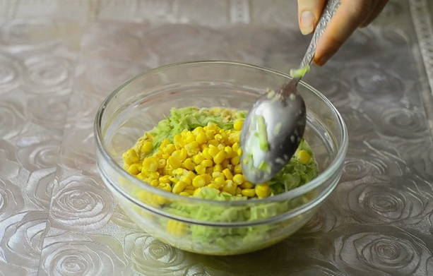- Voeg vervolgens de maïskorrels toe en meng opnieuw. We laten het werkstuk vijf minuten staan, zodat de vlokken overtollige vloeistof opnemen. En op dit moment verwarmen we een koekenpan met plantaardige olie.
