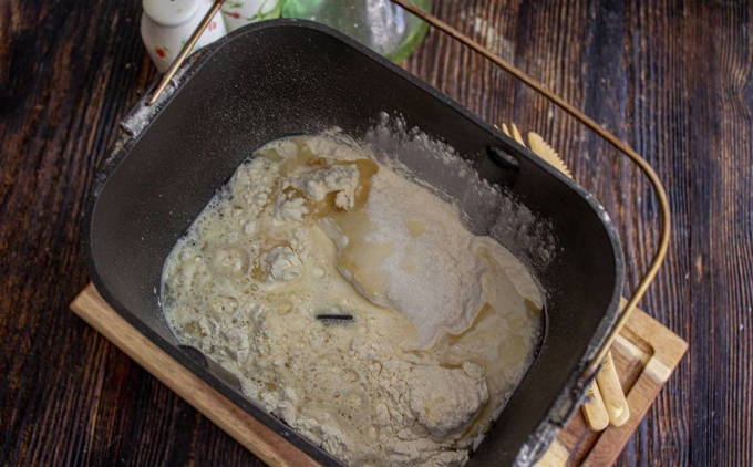 - Doe de ingrediënten voor het deeg in de emmer van de broodmachine: eerst droog, dan vloeibaar. Selecteer het programma Gistdeeg en wacht tot het kneden klaar is.