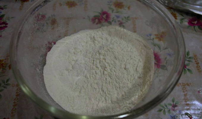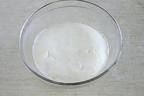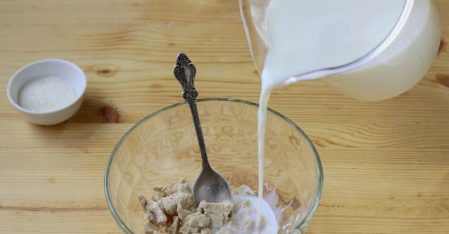 - Eerst moet je het deeg bereiden. Giet gist, een eetlepel bloem en suiker in een kom, giet er warme melk bij, roer, dek af met een handdoek en laat 15 minuten op een warme plaats staan.
