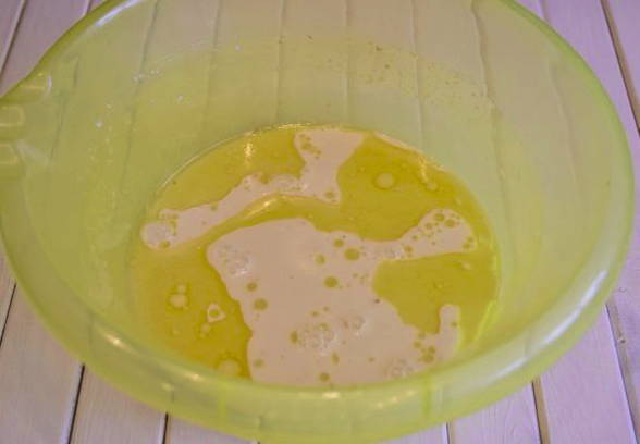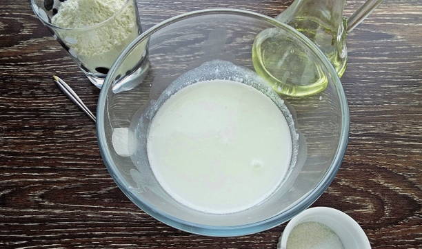 - Warm melk en water een beetje op. Meng in een kom melk, water, plantaardige olie, droge gist en zout.