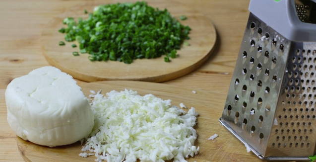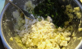 - Voeg vervolgens gehakte gekookte eieren en geraspte pekelkaas toe. Roer en de vulling is klaar.