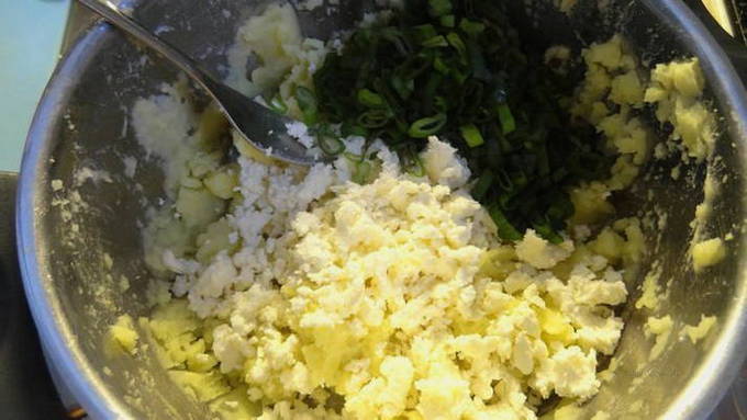 - Verdeel de aardappel-kaasvulling in 3 gelijke delen.