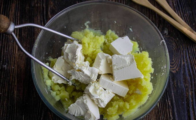 - Schil en kook de aardappelen tot ze gaar zijn. Voeg kaas en zout toe, roer ingrediënten.