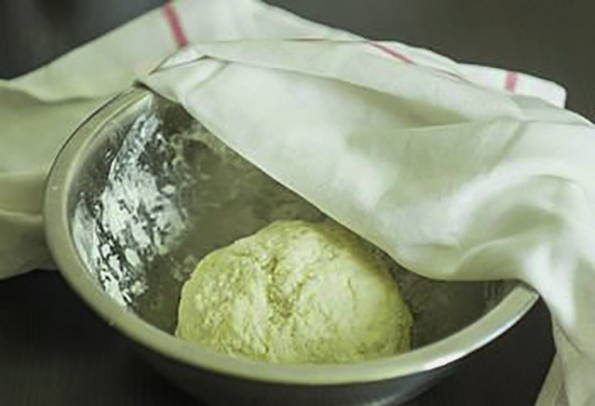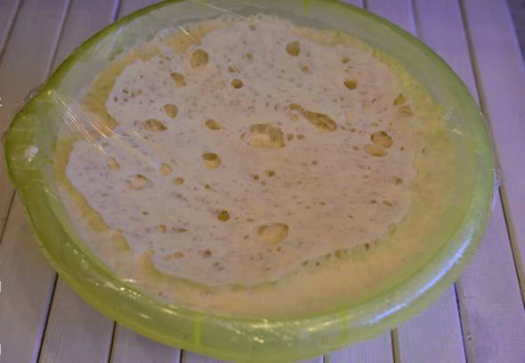 - Bedek de kom met het deeg met voedselschuim en laat op een warme plaats rijzen.