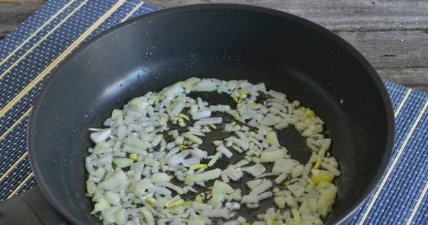 - Schil de ui, hak ze fijn en bak ze in plantaardige olie.