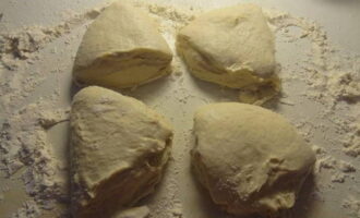 - Verdeel het afgewerkte deeg in 4 delen, rol elk in een dunne ronde cake.