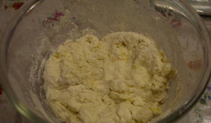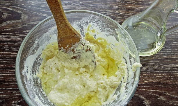 - Giet kefir in een kom, roer. Het deeg moet dik en zacht zijn.