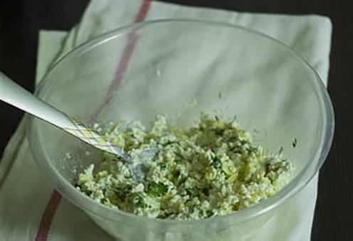 - Hak de koriander fijn met een mes. Rasp de kaas op een grove rasp. Meng kwark met kaas en kruiden, voeg zout naar smaak toe. Gemalen peper en nootmuskaat.