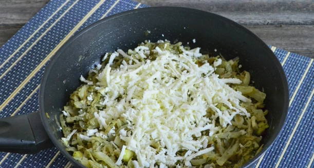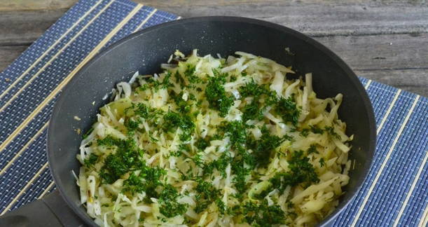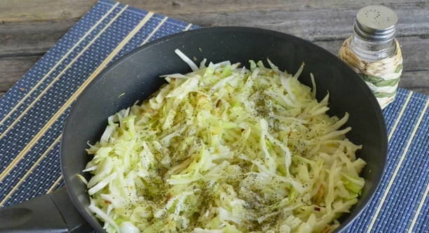 - Snijd de kool, voeg toe aan de ui, zout, breng op smaak en laat 15-20 minuten sudderen op middelhoog vuur, afgedekt.