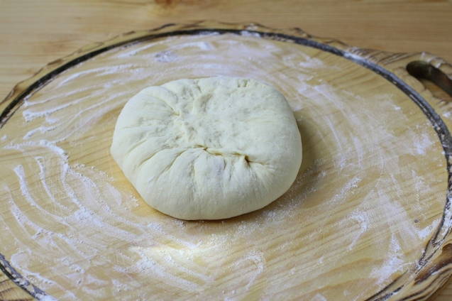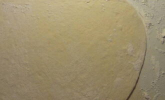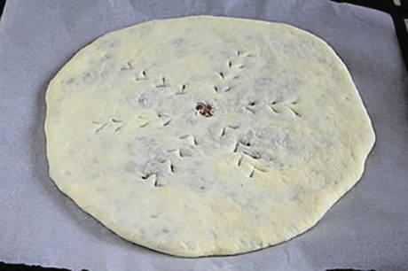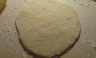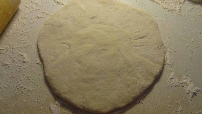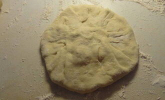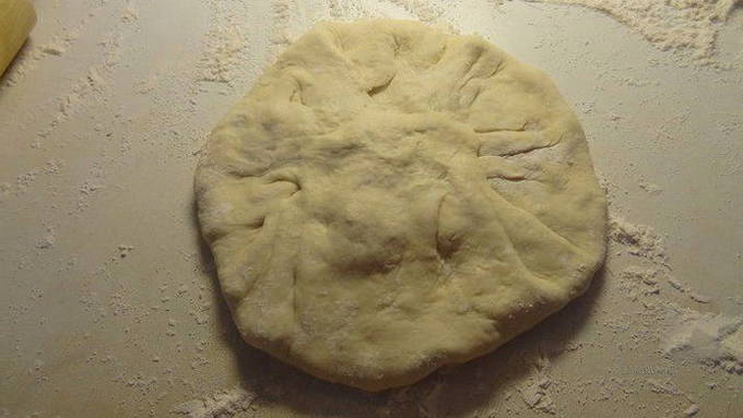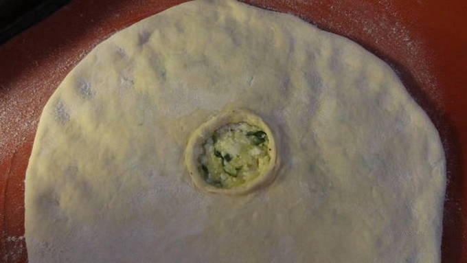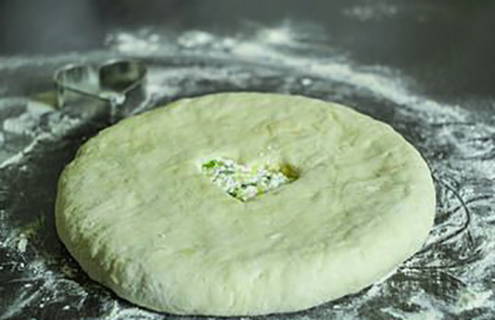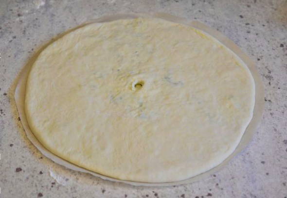 - Draai de gevulde bundel met de naad naar beneden en rol deze uit tot een dikte van 1,5-2 centimeter, maak een klein gaatje in het midden. Leg de blanco's van de Ossetische taart op een bakplaat of in een ronde vorm.
