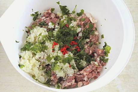 - Bereid de vleesvulling voor. Pel de uien en knoflook. Hak de ui fijn, haal de knoflook door een pers. Rol het vlees door een vleesmolen. Snijd de hete peper heel fijn, hak de koriander fijn met een mes. Combineer alle gemalen ingrediënten in een kom, voeg zout, gemalen peper en bouillon toe, roer.