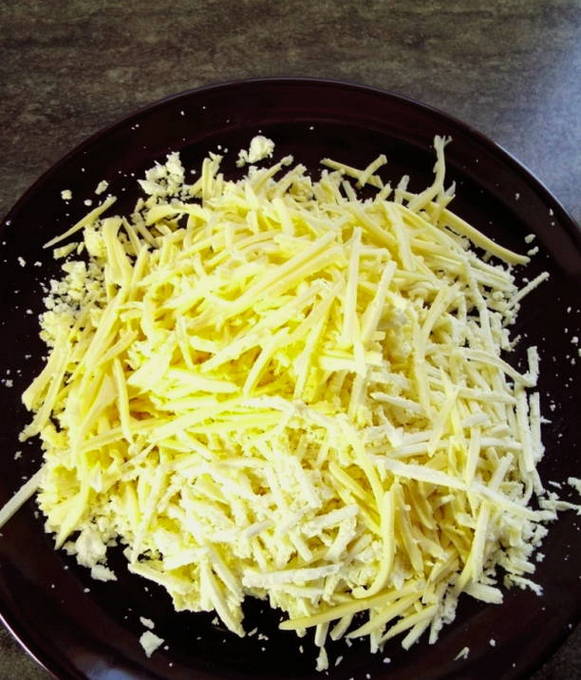- Rasp de kaas op een grove rasp, voeg toe aan een kom.