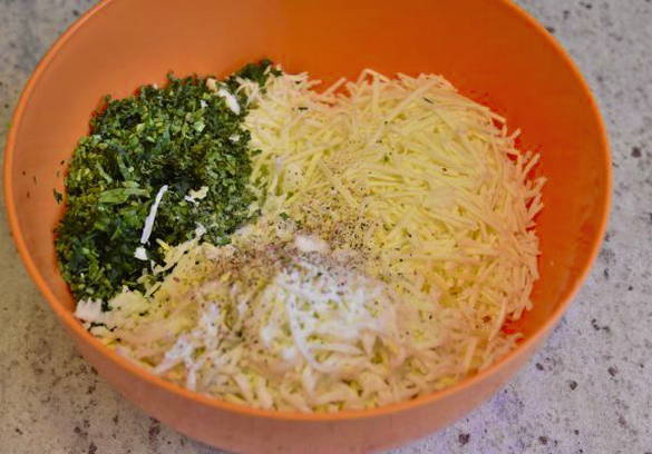 - Hak de groene ui fijn met een mes. Rasp de kaas op een grove rasp. Combineer spinazie, ui en kaas.