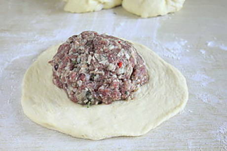 - Wikkel het deeg dat met je handen is opgekomen en verdeel het in drie delen. Rol elk stuk deeg in een dunne cake, leg de vleesvulling.