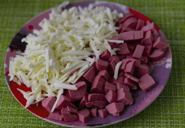 - Vooraf hardgekookte kippeneieren, schillen en fijn hakken. Was de greens en hak ze fijn met een mes. Rasp de kaas op een grove rasp. Combineer de gemalen ingrediënten, voeg naar smaak zout en gemalen peper toe.