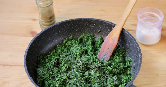 - Bak gehakte spinazie met zout en gemalen peper in plantaardige olie.