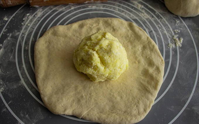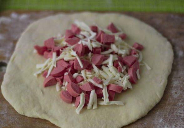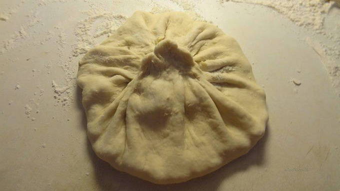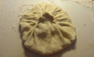 - Rol het deeg uit tot ronde cakes, leg de voorbereide vulling in het midden van elk. Verzamel de randen van het deeg in het midden en houd ze bij elkaar.