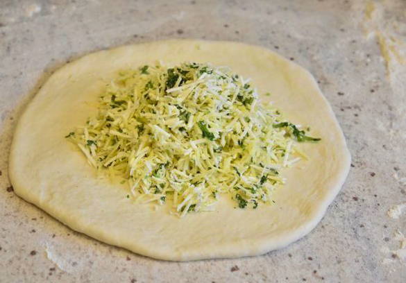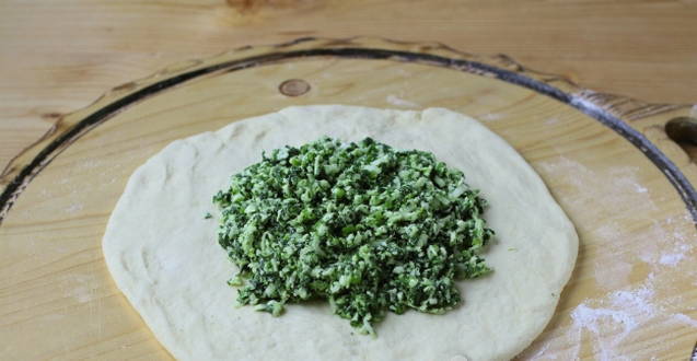- Verdeel het deeg in 4 delen, rol elk in een ronde cake. Leg de spinazie en kaasvulling op het deeg.