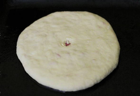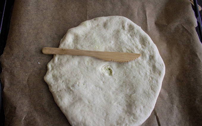 - Begin voorzichtig, maak de cake eerst plat met je handen en vervolgens met een deegroller. Je zou een platte cake van 1,5-2 centimeter dik moeten hebben. Leg de cake op een bakplaat, maak een klein gaatje in het midden om de stoom eruit te laten.