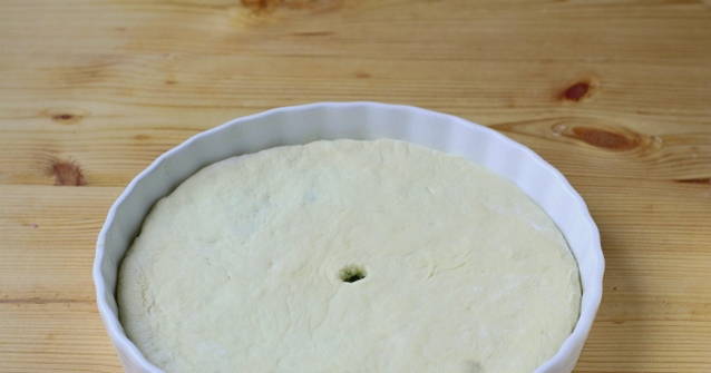 Giet gist, zout en suiker in kefir op kamertemperatuur, meng. Voeg vervolgens het kippenei en de zure room toe, mix tot een gladde massa. Voeg vervolgens de gezeefde bloem in delen toe en kneed tot een homogeen deeg. Bedek het deeg met een schone handdoek en houd het warm terwijl je de vulling maakt.