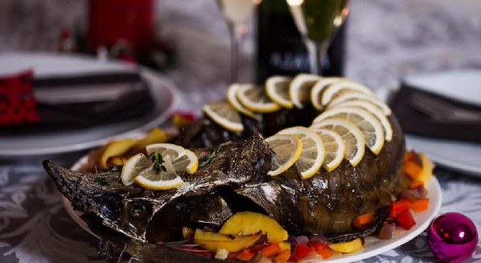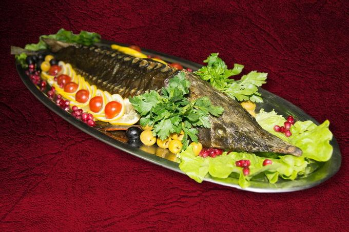 - We halen de afgewerkte schaal uit de oven en brengen deze met brede spatels over naar een grote serveerschaal, decoreren met citroen, takjes groen. De steur kan op de achterkant gedecoreerd worden met subtiele mayonaisepatronen.