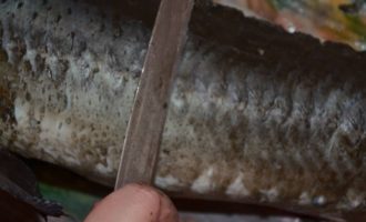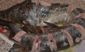 - Vanaf het begin moet je de gestripte steur onder koud water afspoelen. We verwijderen de vizigu, die langs de wervelkolom loopt. Breng in een grote pan water aan de kook en leg de vis een paar seconden in kokend water, houd hem aan de ene kant met een spatel vast en aan de andere kant bij de staart. En onmiddellijk daarna met heel koud water over de vis gieten. Daarna wordt de huid, samen met de doornen, gemakkelijk verwijderd. Spoel de vis indien nodig af en dep droog met een handdoek. Bestrooi de vis met kruiden en zet opzij om te marineren.