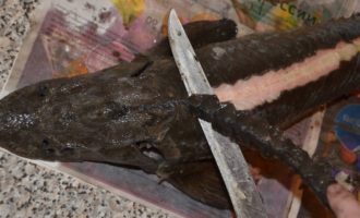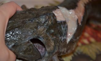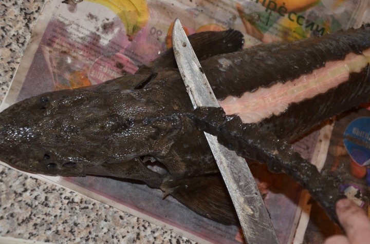 - Om de steur te reinigen, koken we water in een brede kom. We leggen de vis een paar minuten in kokend water, halen de doornen aan de achterkant en zijkanten eruit en verwijderen ze, ze kunnen met een mes worden afgesneden. We halen de vizig eruit, hiervoor maken we een kleine incisie bij de staart en trekken de vizig eruit, waarbij we de vis bij de staart in gewicht vasthouden.