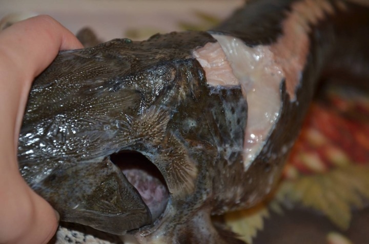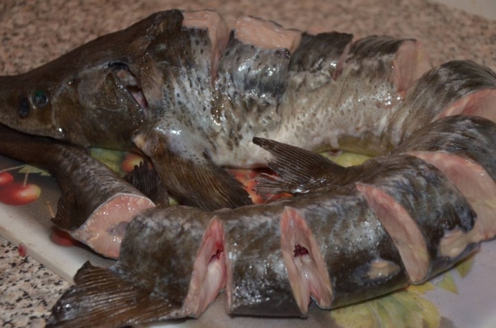 Om de volle smaak van de steur te voelen, is het belangrijk om hem goed te wassen van slijm, van vuil, vooral na het afsnijden van de geile schubben op de rug en zijkanten.