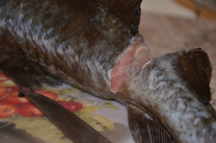 En meteen maken we dezelfde incisie in de staart van de vis. In het midden zie je een richel, deze moet er helemaal uitgetrokken worden zonder te breken.